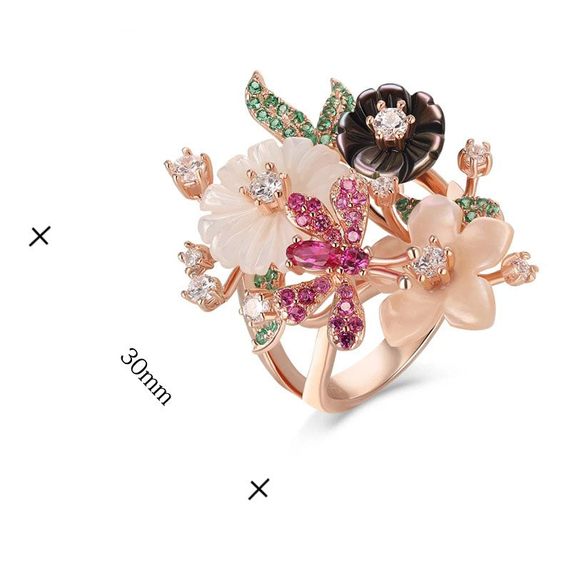 This ring features a vibrant bouquet of flowers, meticulously crafted with enamel details. The design is brought to life with a sparkling dragonfly adorned with pink zirconia stones, adding a whimsical touch.